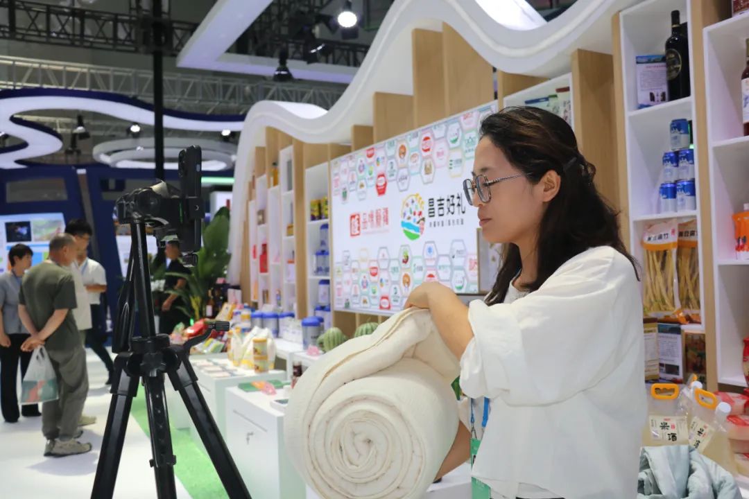 新疆唯美棉品家紡有限公司精心挑選了爆款夏涼被、純棉襪子、短袖、床上四件套等獨(dú)具特色的新疆棉制品參展。呼圖壁縣是新疆發(fā)展紡織服裝產(chǎn)業(yè)確定的“三城七園一中心”的七園之一,同時(shí)也是全國(guó)棉花生產(chǎn)強(qiáng)縣、國(guó)家優(yōu)質(zhì)棉生產(chǎn)基地。該企業(yè)2016年落戶呼圖壁,以棉被加工、銷售為主。目前,日產(chǎn)棉被可達(dá)2500床,年可生產(chǎn)棉被80-90萬(wàn)床。在商博會(huì)其間,該企業(yè)不僅線下與國(guó)內(nèi)外客商進(jìn)行深入交流,同時(shí)在線上以直播帶貨的方式尋求合作商機(jī)。新疆唯美棉品家紡有限公司直播負(fù)責(zé)人馬晶說:“商博會(huì)期間,我們公司的品牌得到了很好的宣傳,希望能充分運(yùn)用好商博會(huì)這一平臺(tái),利用電商平臺(tái)把更多、更好的新疆特色農(nóng)產(chǎn)品推銷出去,讓全國(guó)各地的消費(fèi)者都蓋上我們新疆好的棉被。”